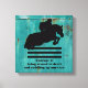 A horse and rider silhouette featuring an equestrian rider on a show jumper / hunter jumping over a fence. Turquoise colored rusted metal background. Quote says: courage is being scared to death and saddling up anyways.