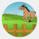 Cute birthday stickers, with cartoon graphics of a happy horse running in a fenced green field. Matching birthday party invitations and children calling cards available, see links below. Personalize the text to read anything you want. Makes great party favors or envelope seals.
