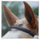 A strawberry roan horse stands at attention with ears forward as he waits to go into the show ring. This gelding pony is ready for English riding with his forelock braided and his English bridle. His dressage competition number can be spotted at the bottom right of the photo.