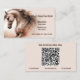 Horse business cards featuring a modern artistic horse design. Great for horse equestrian shops and more. Brown and orange colors. Add all your business details including your name, title, contact information, and social media handles. Also, use the QR code for your online business. Great mix of traditional and digital to meet your business needs. Use the template to create your own horse business cards.