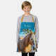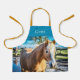 Apron for children with a horse in a pasture design. A pretty palomino horse is featured on a design that wraps around. Top section on the bib is sky blue with a place for his or her name. Apron straps are golden brown. Perfect for the budding chef and baker who happens to love horses.