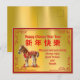 Our Horse in Red Costume Chinese New Year Card shows a cute baby horse wearing a red Chinese costume. The image and text are printed on a gold foil-like background.