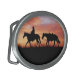 A horse and rider leading a pack horse during sunset decorates this attractive belt buckle