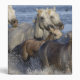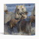 A herd of horses and foals running across a lake