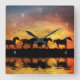 A herd of wild horses galloping through the sunset, their movements beautifully reflected in a tranquil pond. A stunning southwestern-style clock.