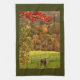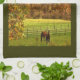 This fine art kitchen towel features a landscape of two brown horses in their green pasture with autumn foliage colors of red, orange, yellow and gold in the hills behind. A fence surrounds the pasture.
