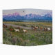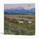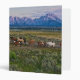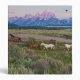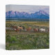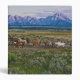This photo features a herd of horses runs in front of the Grand Teton mountain range in rural Wyoming during the early morning light.