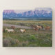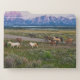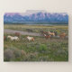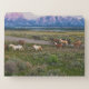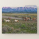 This photo features a herd of horses runs in front of the Grand Teton mountain range in rural Wyoming during the early morning light.