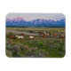 This photo features a herd of horses runs in front of the Grand Teton mountain range in rural Wyoming during the early morning light.