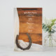 Customize the rustic chic Horseshoe and Satin Country Western Wedding Menu with the details of the meal that you will serve at your informal farm style bridal shower luncheon, rehearsal dinner or marriage reception when you add the salad or first course, entree or second course and dessert or third course. This charming custom ranch theme wedding menu features a digitally enhanced photograph of a rusty horseshoe and white satin and a weathered barn wood background. Perfect for the couple who has planned a casual yet classy rural country farm, barn party, ranch, equestrian, horse or western wedding theme.