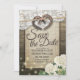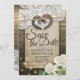 Rustic Country Style Modern Wedding Save The Date Invitation Card Templates -Couple Old Horseshoe Heart with Rope Bow Knot and White Lace, Hydrangea Flower, String Lights and Burlap Cloth on Old Barn Wood Background.