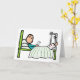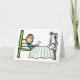 Hospital Bed design shows stickman reading a card while lying in bed. Has a broken leg in a signed cast raised by special equipment. Patient has comfy pillows and a relaxed resigned attitude to a hospital stay. Get well soon!