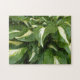 This photo features a close-up of a mass of green-and-white hosta leaves.