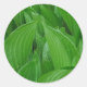 Lovely custom stickers feature a nature photograph of young hostas starting to unfurl. The new green leaves are covered with raindrops. The veins in the plant leaves appear as pale green stripes that follow the curves of the leaves.