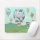 Bright and colorful cartoon scene of hot air balloons in the shape of farm animals flying high over a hilly countryside. Fun image for both kids and kids at heart.