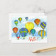 A "Hello" postcard for keeping in touch with colorful hot air balloons floating high in the sky on a peaceful cloudy day illustrated with watercolor.