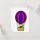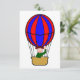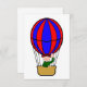 Riding in a hot air balloon is a lot of fun. You are floating away. This design features a great looking hot air balloon. The balloon itself is red and blue. In the basket is a solitary person who is smiling and waving. This hot air balloon design looks great on these invitations
