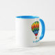 Two tone white and sky blue mug with a colorful hot air balloon on either side. "Imagine..." is written in blue beneath each balloon. Great gift for graduates, artists, or just plain dreamers!