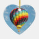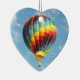 Bright ornament with photo of multi-colored hot air balloon against the blue sky.
