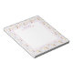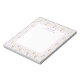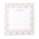 A notepad with a cute and whimsical pattern. Hot air balloons and cute clouds with faces among stars and hearts and balloons. Soft pastel colors make up this adorable design. A white square with a pink border layered over top to write inside.