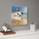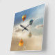 A beautiful photograph montage of yellow and blue hot air balloons with their reflections in the serene water below, with the blue sky and clouds in the background and a roman numeral clock face.