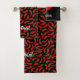 Red hot chili peppers. Custom background colour. Pepper icon on wash cloth. Seamless pattern on hand and bath towel. Custom text on all three towels.