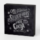 This chalkboard hot cocoa bar sign features chalk hand lettering that says "Old Fashioned Sleigh Rides and Hot Cocoa on the Farm" on a faux chalkboard background. The lettering features decorative swashes and ornamental swirls.
