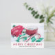 Holiday postcard with a warm comforting Christmas photo. A hot mug of cocoa with marshmallows, a striped candy cane, a green and white striped scarf and red gloves covered in snow. Ahhh, a warm drink after coming in from the cold really hits the spot. A festive holiday photo. Message you can personalize on the back.
