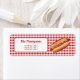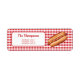 Destei's fast food illustration of a hot dog bun with a grilled sausage that has some ketchup and mustard on top. The background has a red and white color gingham pattern. There are also two personalizable text areas.
