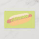 Create a handy hours of operation card for your hot dog stand or other business with this easy to customize business card. The front of the card features a vertical layout with a hot dog illustration and your own custom text. The back of the card features a larger illustration of a hot dog against a lime green background.