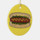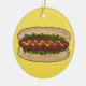 Ornament features an original marker illustration of a delicious hot dog with mustard and relish.