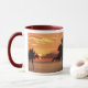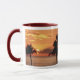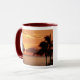 white mug with red rim and handle, picture of red, orange, yellow tropics sunset with palm trees, and text reads: "I don't have hot flashes. I have short private vacations in the tropics."