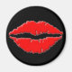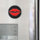 A round magnet with a woman’s lip print on a black background.