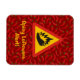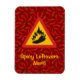 Triangle warning sign with a pepper and flame silhouette. Seamless pattern background. Custom text.