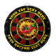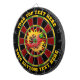 Dark red, black, green and yellow dartboard design. Each color is customizable. Hot pepper in flame circle. Two custom text areas on outer ring.