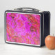 This vivid lunch box features swirls of hot pink, magenta, black, cream, and gold,. This unique lunch box is a colorful and fun way to port around your lunch or lots of other things. It also makes a nice gift. The trim is in black but you can choose other colors.