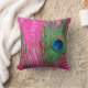 Amazing background brings out the greens and blues of the peacock eye. This throw pillow has a lovely pink design for the animal lover.