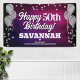 Fun banner sign for indoors or out, featuring festive silver metallic balloons on both sides of the design with sparkly, silver metallic confetti on a rich textured hot pink & purple colored background for your personalized birthday banner. This product doubles as a wonderful milestone birthday keepsake.