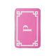 Decorative white Greek Key style geometric rectangular border on a hot pink 20” x 30” bath mat with a modern serif monogram.