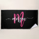 Hot Pink Black Modern Script Girly Monogram Name Beach Towel