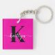 This modern hot pink keychain with your first name in a trendy script font in white and your first initial in a modern cap font in black is perfect for your keys. It's stylish and trendy and yet very classic.