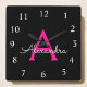 Hot Pink Black Script Girly Monogram Name Square Wall Clock