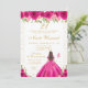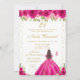 This elegant and glamorous birthday party invitation features a beautiful princess with brunette hair and fair skin in a hot pink ball gown. The text combines handwritten script and modern sans serif fonts for a classy and sophisticated look. The floral arrangements, butterflies and gold confetti create the perfect blend of rustic and chic.