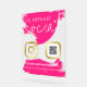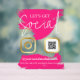 Acrylic let's get social sign with printed hot pink brushstrokes, your QR code and faux gold social media icon personalized with your social media handle. Social media promotional sign with white fonts and hot pink paint strokes printed on an acrylic background personalized with your QR code so your clients and customers can easily access your social media.