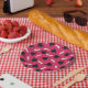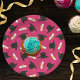 Graduation party paper plates printed with a hot pink pattern of graduation caps and diplomas with a yellow ribbon.