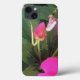 The artwork on this iPhone 13 Case is an original photograph by MaeFlowers of a New Guinea impatiens plant, in bloom with hot pink flowers. The photo is a closeup showing parts of the bright pink flower petals, a flower bud in a more pale pink color, and the remains of an earlier bloom. The dark green leaves of the impatiens are long and pointed, with jagged edges against a warm light gray background. The design has a tapestry texture.