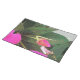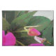 The artwork on this Placemat is an original photograph by MaeFlowers of a New Guinea impatiens plant, in bloom with hot pink flowers. The photo is a closeup showing parts of the bright pink flower petals, a flower bud in a more pale pink color, and the remains of an earlier bloom. The dark green leaves of the impatiens are long and pointed, with jagged edges against a warm light gray background. The design has a tapestry texture.
