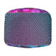 An abstract camo design with shades of hot pink and cool blue on the top then contrasting on the sides of the pouf is a matching ombre shades of bglittery blue and pink stripes for contrast. Stylish modern vibes.