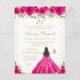 This elegant and glamorous birthday party invitation features a beautiful princess with dark hair and dark skin in a hot pink ball gown. The text combines handwritten script and modern sans serif fonts for a classy and sophisticated look. The floral arrangements, butterflies and gold confetti create the perfect blend of rustic and chic.