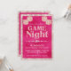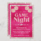 This custom ladies game night invitation features a glamorous and sparkly theme over a hot pink colored, foil style background. The phrase "Game Night" is printed in soft pink glitter, with a band of diamonds below it. Two sets of dice are printed at the top in each corner. The border is a luxurious sequins pattern.